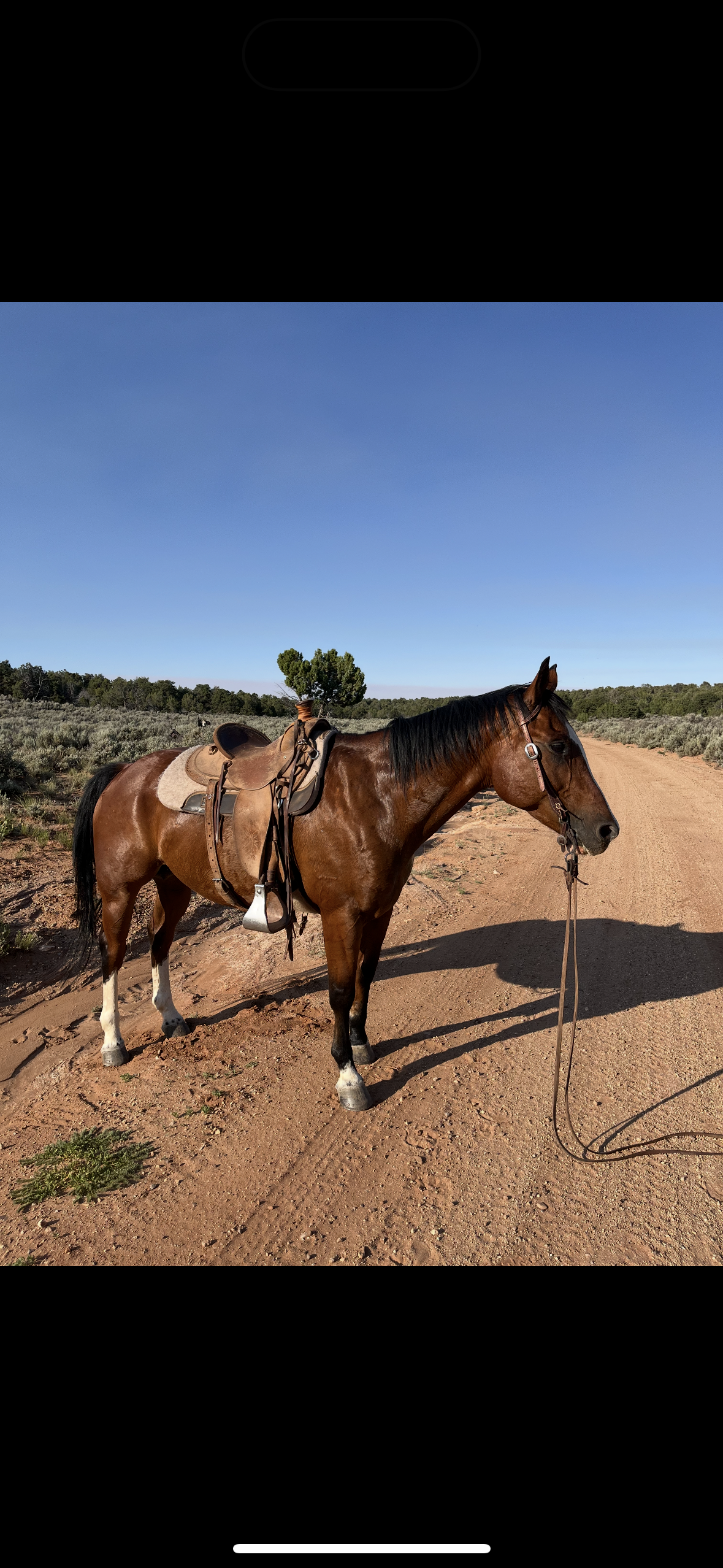 “Striker” is a 2016 bay AQHA gelding. He has done all kinds of ranch work and is very gentle. He has been good with all levels of riders. He is a horse that has been laid off for up to 6 months at a time and is the same as the last time he was ridden. He is good with kids but can also be ridden to get a job done. He’ll be offered in the San Juan Ranch Horse Sale in Monticello, Utah on July 12, 2025.